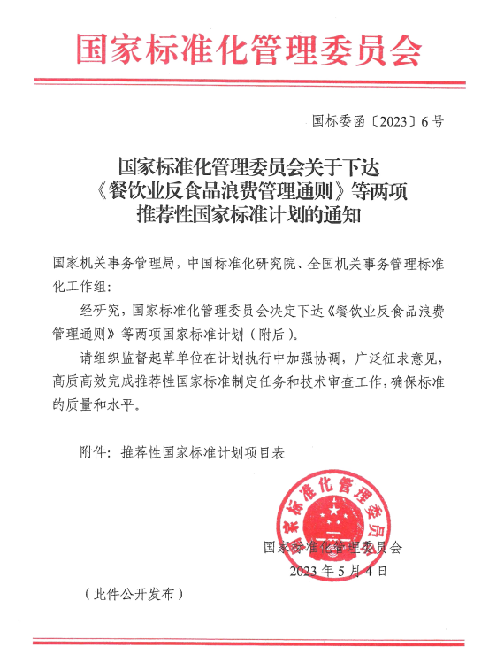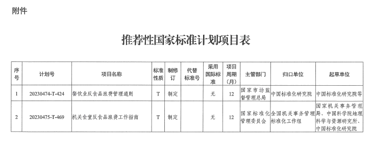 中国质量新闻网讯 近日,国家标准化管理委员会发布关于下达《餐饮业反食品浪费管理通则》等两项推荐性国家标准计划的通知。