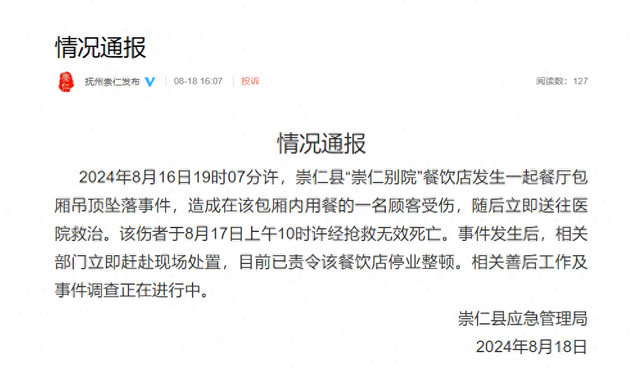 2024年8月16日19时07分许,崇仁县“崇仁别院”餐饮店发生一起餐厅包厢吊顶坠落事件,造成在该包厢内用餐的一名顾客受伤,随后立即送往医院救治。该伤者于8月17日上午10时许经抢救无效死亡。事件发生后,相关部门立即赶赴现场处置,目前已责令该餐饮店停业整顿。相关善后工作及事件调查正在进行中。