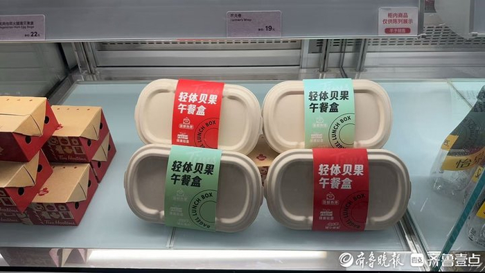 近日,记者来到位于济南万象城的Tims天好咖啡店内,看到展柜上除了摆放着各类咖啡饮品,还有贝果、农夫卷以及“轻体贝果堡午餐盒”系列产品。