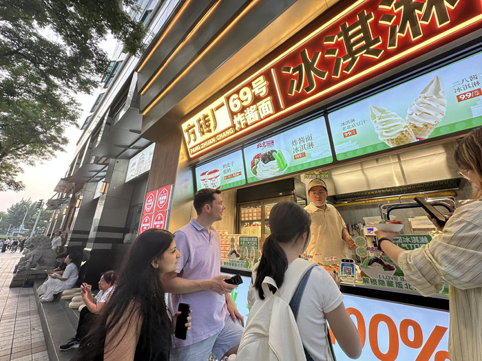 随着暑期和旅游旺季来临,蒋盼盼也注意到,消费者在用餐的同时,对“炸酱面文化”的了解需求大幅增加。据统计,超40%的游客会主动向服务员询问吃面技法与菜码文化。“所以我们为了应对需求,也在服务培训中新增吃面三部曲及方砖厂文化应答模块’,要求服务员掌握炸酱面的典故、炸酱制作工艺要点,同时也要求服务员要掌握多语种炸酱面关键词’的解读。”