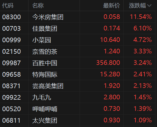 港股餐饮股普遍上涨,其中,细价股今米房集团涨超11%领先,小菜园涨近5%,奈雪的茶、百胜中国涨超3%,特海国际涨2.5%,九毛九、呷哺呷哺涨超1%。
