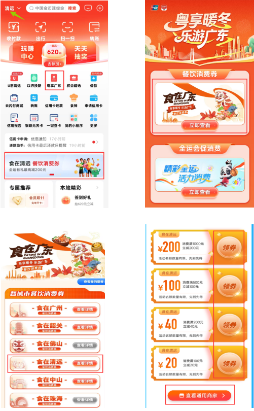 3.点击首页“粤享广东”入口,选择“食在广东”进入城市餐饮消费券页面后,点击“食在清远”即可进入活动页面领取消费券;或点击首页“食在清远”餐饮消费券轮播图也可直接进入活动页面领取消费券