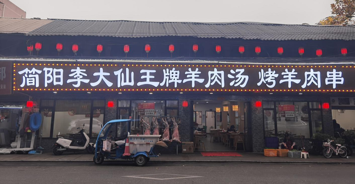 ▲简阳李大仙王牌羊肉汤 烤羊肉串店19日晚上6点,红星新闻记者来到了位于三官堂的一家羊肉汤店,看到店内和店外的100多张桌子已经被食客们坐得满满当当。老板告诉记者,每年吃羊肉汤的高峰季节是11月初到12月底这段时间,平均每天都要卖两三百斤的羊肉,而冬至当天更是能卖2000斤左右。