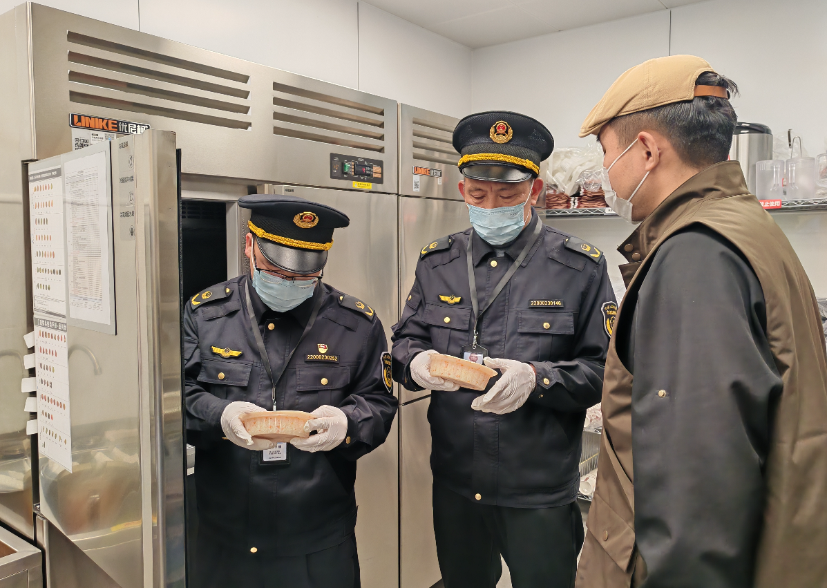 12月22日,执法人员在一家连锁经营单位检查食材采购及储存情况。
