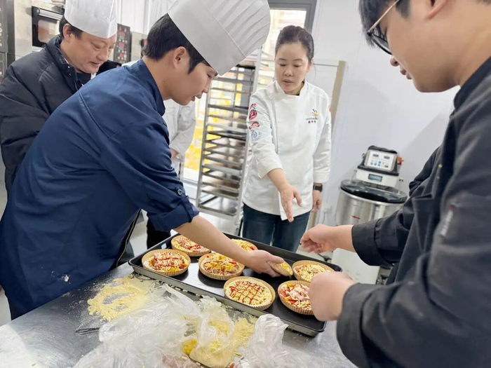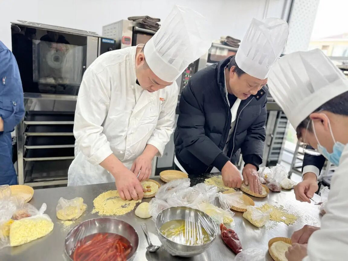 比赛内容紧扣行业实际,共设置点心制作、食品安全知识竞赛和招牌菜展示三大赛项。点心制作环节,上海工匠郁慧现场讲解披萨制作的关键步骤,从面团发酵到火候控制,边示范边提醒细节。参赛选手随即动手实操,在规定时间内完成“自选创新披萨”。