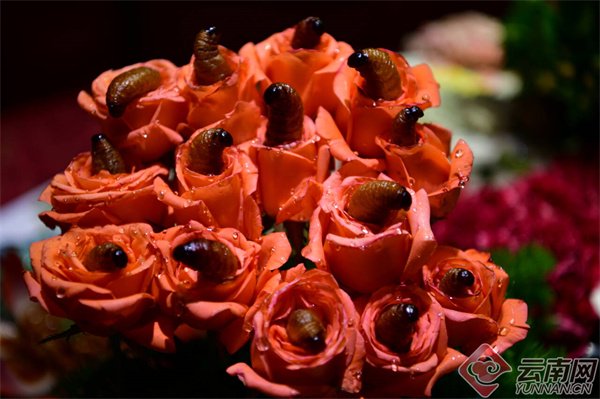 云南省餐饮与美食行业协会联合创会会长蒋彪、关明,资深中国烹饪大师张大勇,中华老字号拓东酱油第十二代传承人杨光福等众多餐饮美食文化名流出席活动,共同为“非遗鲜花宴”品牌发声。餐厅内,鲜花与绿植点缀其间,巨幅壁画、老式新闻报道照片与20世纪80年代昆明流行的蚊子铃(曼托铃八弦琴)、吉他相映成趣,营造出兼具复古韵味与鲜花美食氛围的就餐环境,宛如一座展示滇菜文化的“移动书橱”。