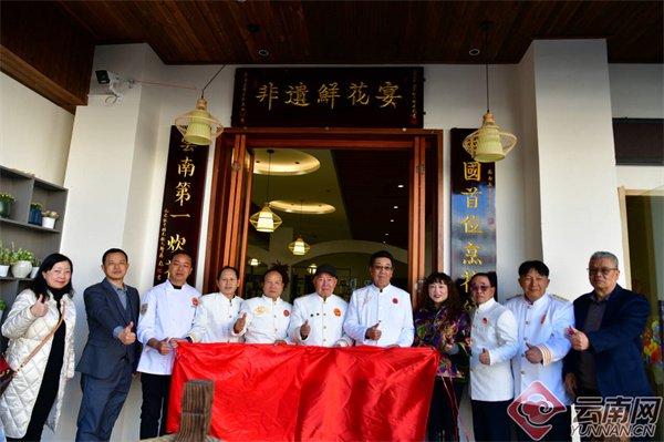 仪式现场,云南美食家李嘉林题词、元老级中国烹饪大师蒋彪题写书法的楠木刻制金匾及美食对联赠予陈生合大师。作为中国首位烹香昆明鲜花宴的烹饪大师、昆明鲜花宴非物质文化遗产代表性传承人,从业30余年的陈生合深耕花卉菜肴烹饪技艺,首创鲜花宴系列菜品,斩获多项行业大奖,其事迹被多家主流媒体报道,个人业绩入选多部美食典籍。此次揭牌不仅彰显其行业影响力,更助力提升昆明鲜花宴美食文化的“含金量”。