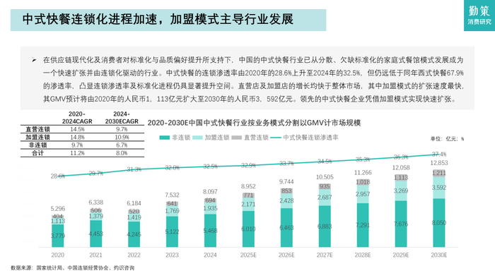 在供应链现代化及消费者对标准化与品质偏好提升所支持下,中国的中式快餐行业已从分散、欠缺标准化的家庭式餐馆模式发展成为一个快速扩张并由连锁化驱动的行业。中式快餐的连锁渗透率由2020年的28.6%上升至2024年的32.5%,但仍远低于同年西式快餐67.9%的渗透率,凸显连锁渗透率及标准化进程仍具显著提升空间。直营店及加盟店的增长均快于整体市场,其中加盟模式的扩张速度最快,其GMV预计将由2020年的人民币1,113亿元扩大至2030年的人民币3,592亿元。领先的中式快餐企业凭借加盟模式实现快速扩张。