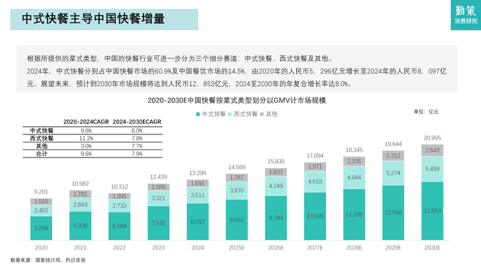 2024年,中式快餐分别占中国快餐市场的60.9%及中国餐饮市场的14.5%,由2020年的人民币5,296亿元增长至2024年的人民币8,097亿元。展望未来,预计到2030年市场规模将达到人民币12,853亿元,2024至2030年的年复合增长率达8.0%。