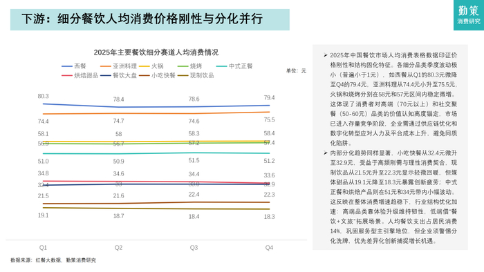 各细分品类季度波动极小(普遍小于1元),如西餐从Q1的80.3元微降至Q4的79.4元,亚洲料理从74.4元小升至75.5元,火锅和烧烤分别在58元和57元区间内稳定微增。这体现了消费者对高端(70元以上)和社交聚餐(50-60元)品类的价值认知高度锚定,市场已进入存量竞争阶段,企业需通过供应链优化和数字化转型应对人力及平台成本上升,避免同质化陷阱。