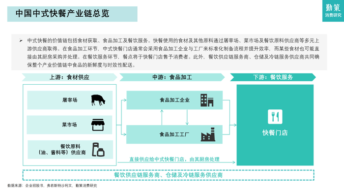 中式快餐的价值链包括食材获取、食品加工及餐饮服务。快餐使用的食材及其他原料通过屠宰场、菜市场及餐饮原料供应商等多元上游供应商取得。