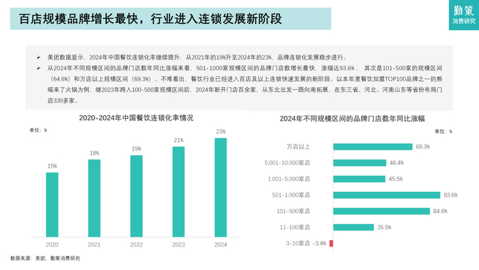 美团数据显示,2024年中国餐饮连锁化率继续提升,从2021年的19%升至2024年的23%,品牌连锁化发展稳步进行。